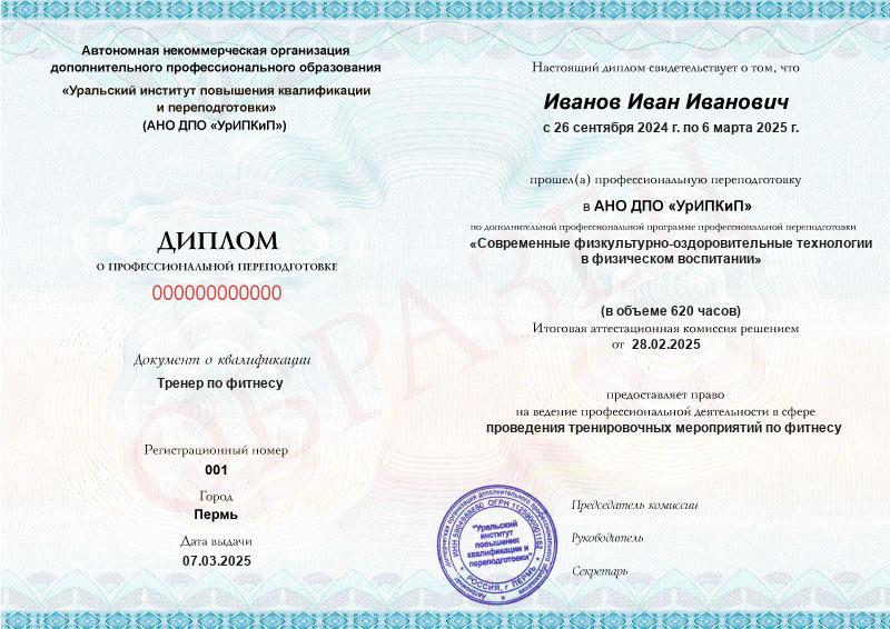 Успешно прошла обучение по дополнительной профессиональной программе профессиональной переподготовки «Современные физкультурно-оздоровительные технологии в физическом воспитании» (в объёме 620 часов) с присвоением квалификации ТРЕНЕР ПО ФИТНЕСУ. Говоря об обучении в АНО ДПО «УрИПКиП» - темы дисциплин раскрыты, дополнительный материал доступен, в временном интервале тоже удобно: можно учиться по нормативу или в ускоренном режиме в свободное время суток. Возникающие вопросы решаются оперативно, к переговорам открыты. Когда что-то ещё решу подучить, то к Вам. Благодарю.
