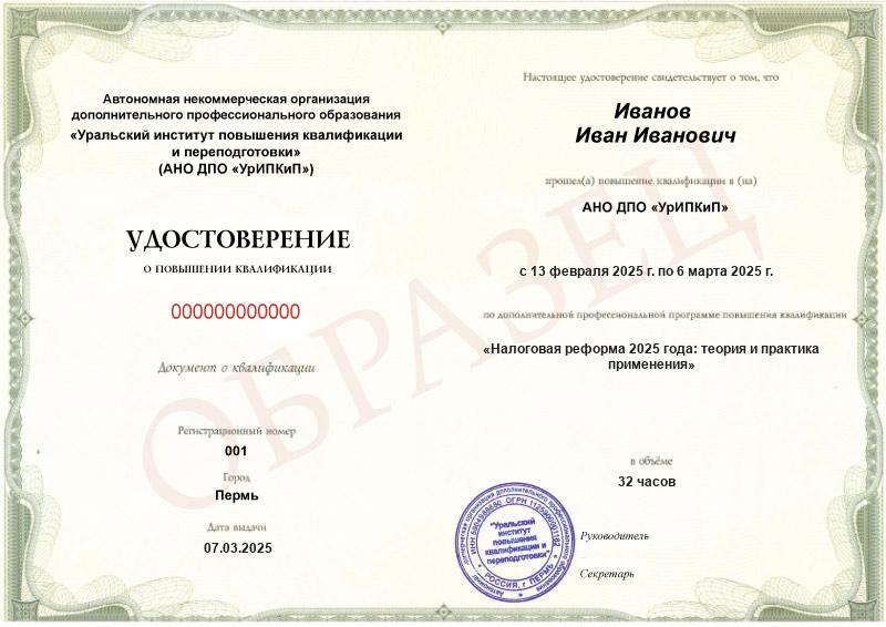 Удостоверение о повышении квалификацииПодтверждает, что вы прошли обучение по программе «Налоговая реформа 2025 года: теория и практика применения»