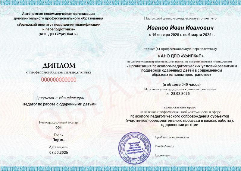 - Образец диплома о профессиональной переподготовке.