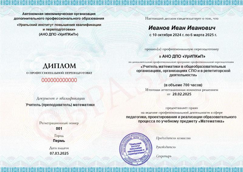 По завершении программы вы получите диплом установленного образца и сможете работать преподавателем математики как очно, так и онлайн.
